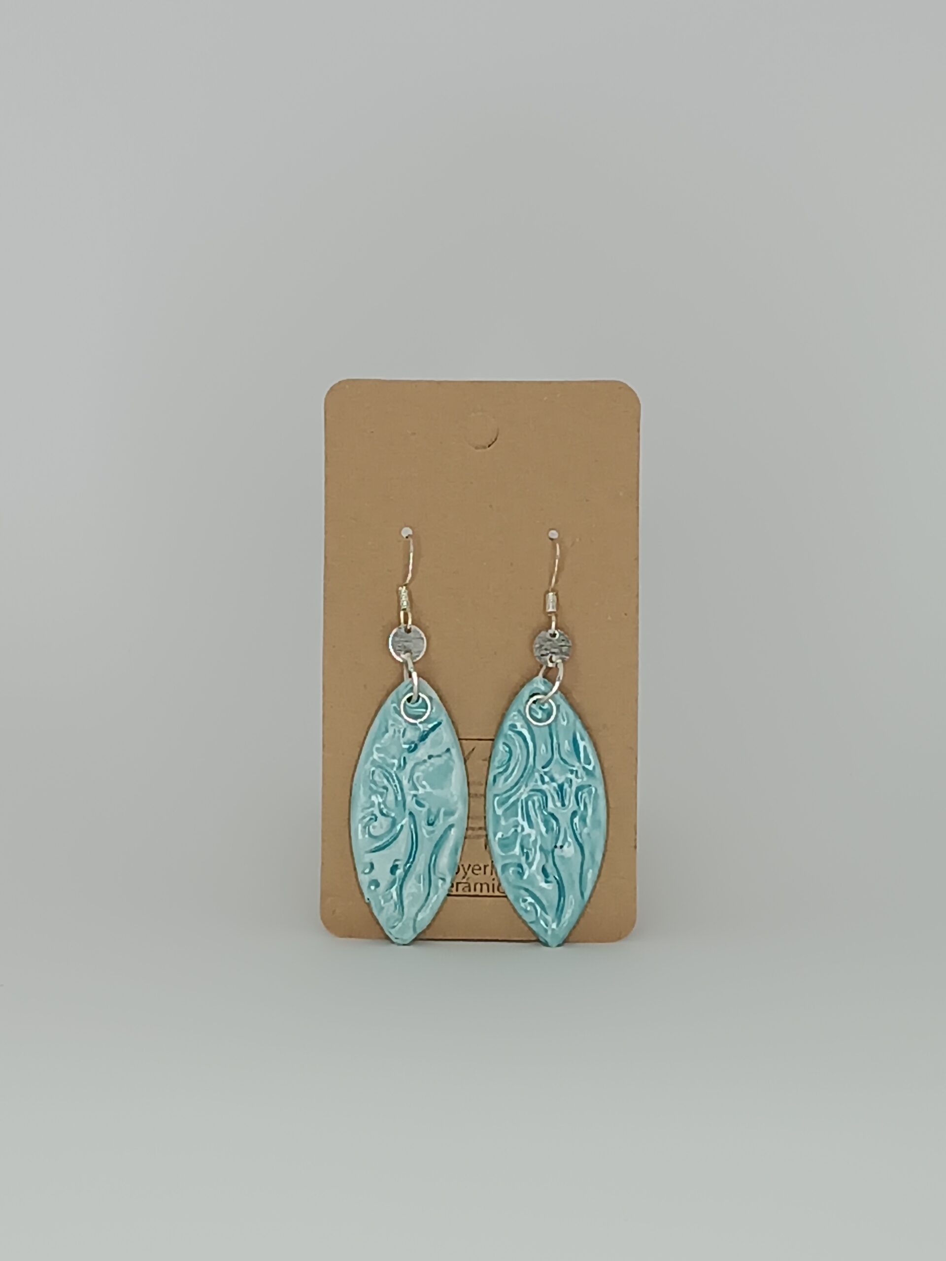 Pendientes largos de cerámica esmaltada y relieve. Con gancho y charm plateado de acero hipoalergénico. Ligeros, e Ideales.