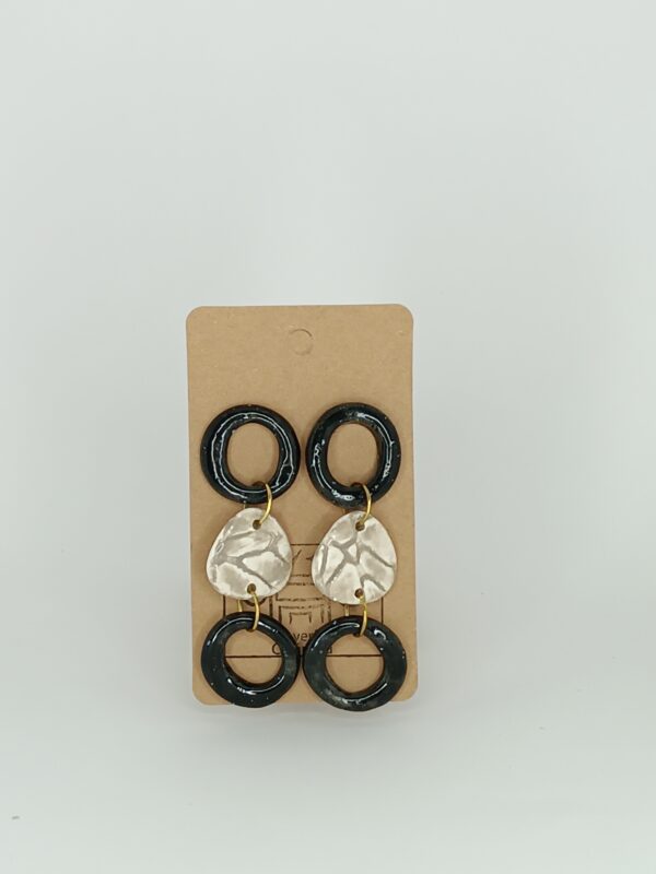 Pendientes de tres piezas cerámicas esmaltadas lisas y en relieve piedra. Con Aros y reuleaux. Cierre de pasadoren acero hipoalergénico. Ligeros, actuales y favorecedores.